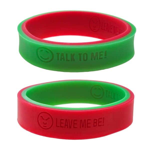 Den ene side er rød og siger "Lad mig være" med en vred smiley, den anden side er grøn og siger "Tal til mig" med en glad smiley.